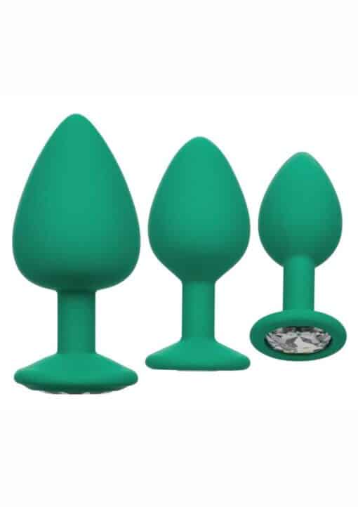 The glamorous anal training kit includes a set of 3 graduated anal plugs with a gem base to let you safely and comfortably increase passionate anal stimulation.