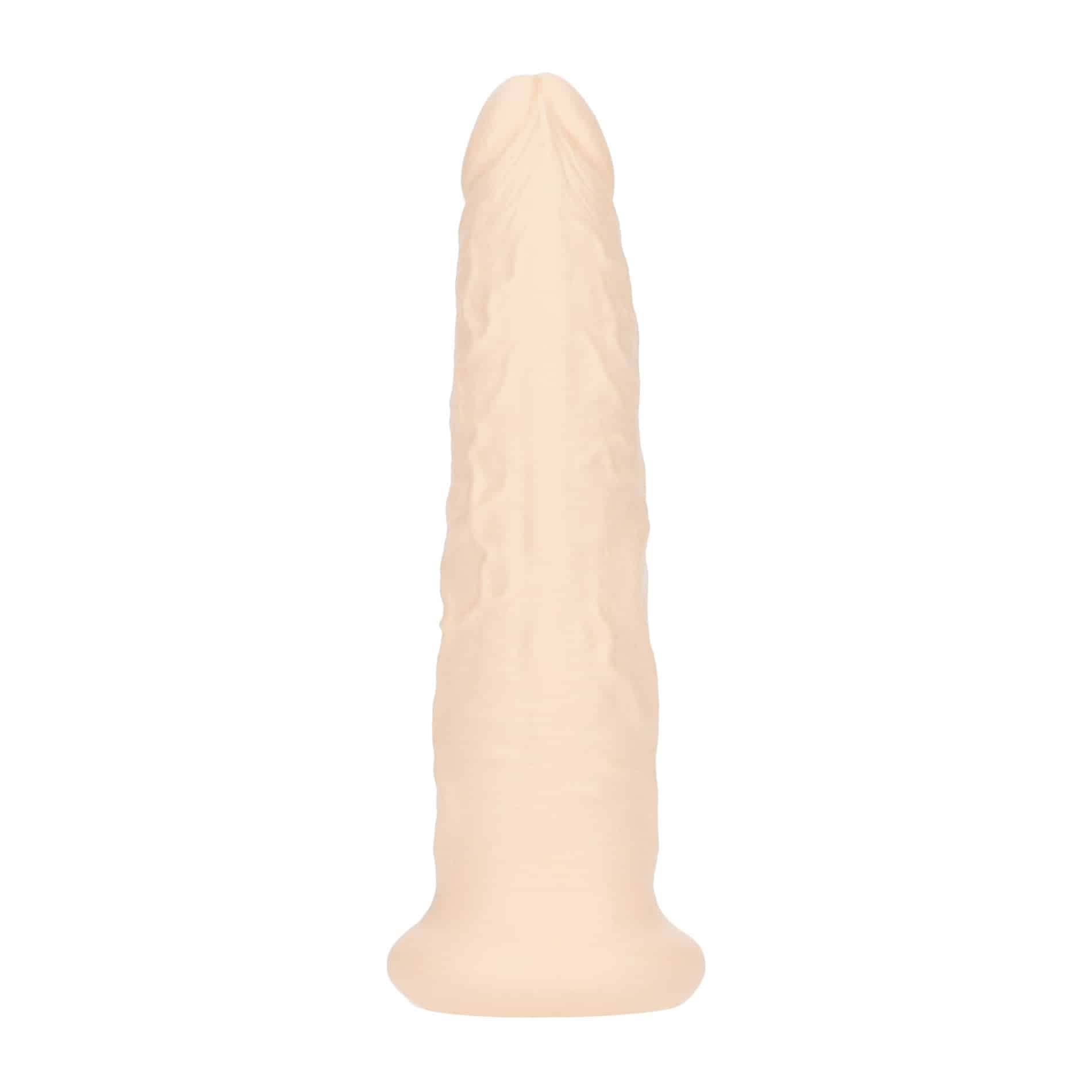 It features a detailed shaft with raised veins, a well-defined glans, and natural skin folds for realistic texture and stimulation.