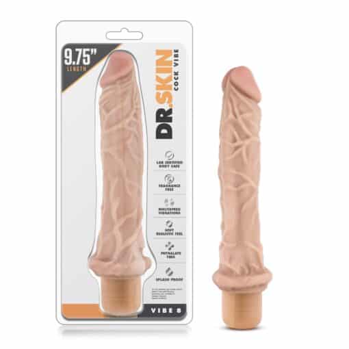 The doctor is in! Blush Novelties Dr. Skin Vibe #8 is a 9.75 inch realistic vibrator with a veiny textured shaft that erotically massages you as you thrust it inside of you. The powerful throbbing vibrations are controlled by a convenient twist dial base. It is waterproof for shower and bath time. Vibe #8 is made of body safe phthalate free PVC. To clean use soap and water or a toy cleaner then let air dry.