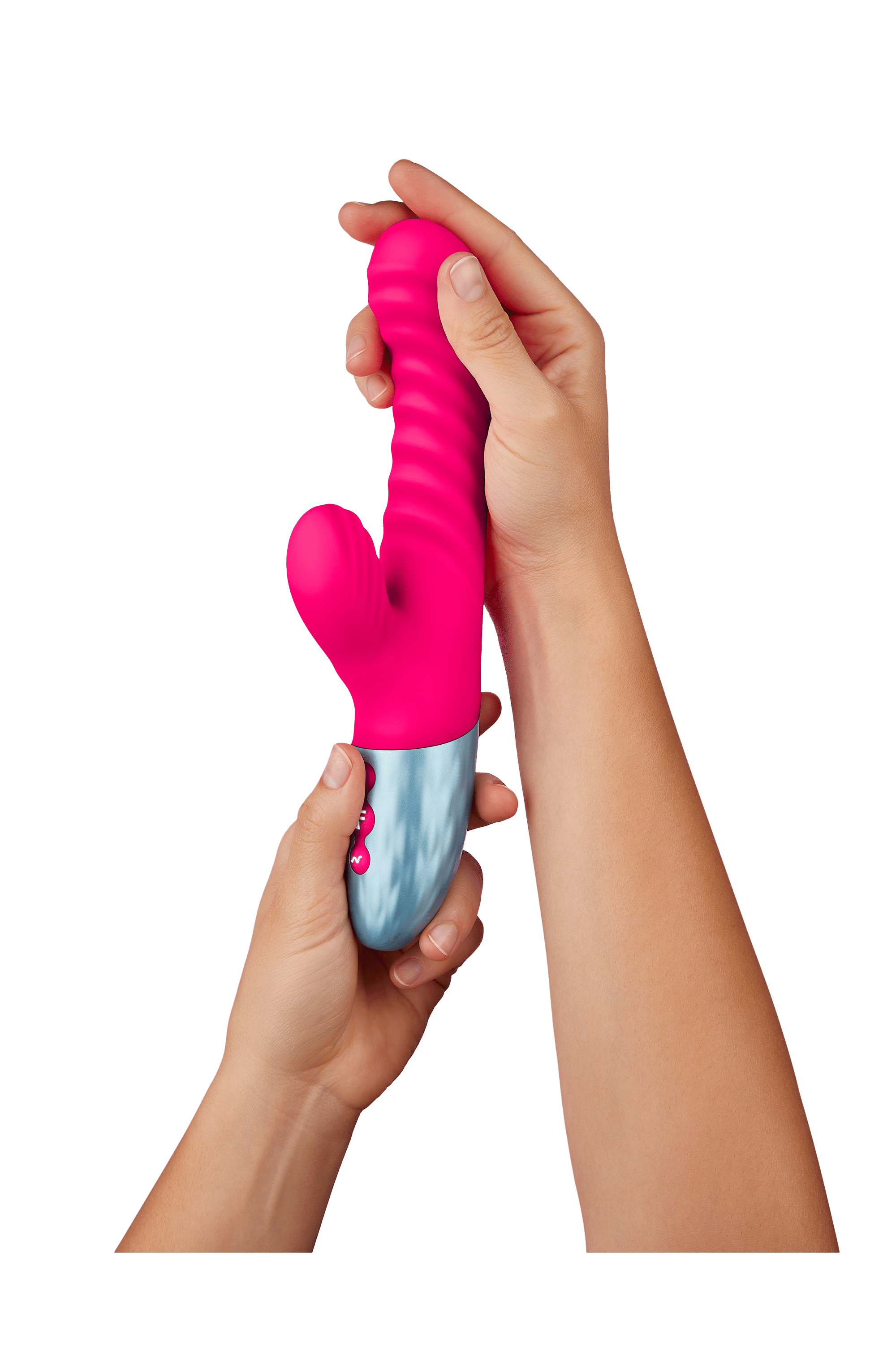 Our ribbed vibrator has a rippled texture, rabbit tip, and curved head stroke every sweet spot until your toes curl and you?re dripping with delight. Don?t worry. It?s splash-proof.