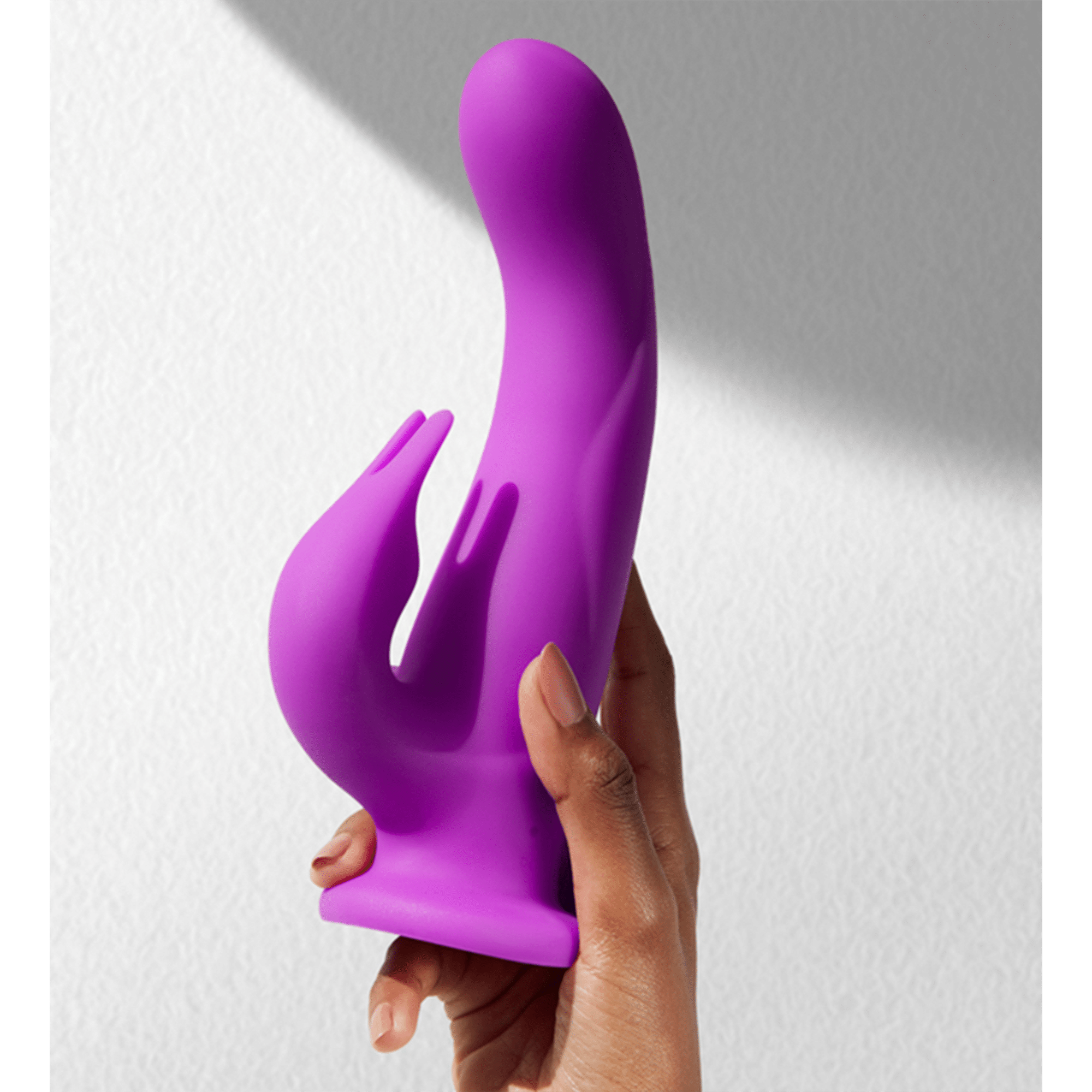 Feel the excitement build as the curved tip strokes your deepest erogenous zones and the rabbit ears titillate your clitoris. The harness-friendly suction base invites wild play with a partner.