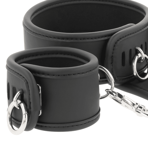 These wives have the elegant aesthetic that you look for while being absolutely effective. Double layer and finished with a metal buckle, your sub will not be able to escape. The padded interior guarantees that you will stay comfortable no matter how much you throw or how long you play. The set has a chain of union to immobilize from the neck to the hands.