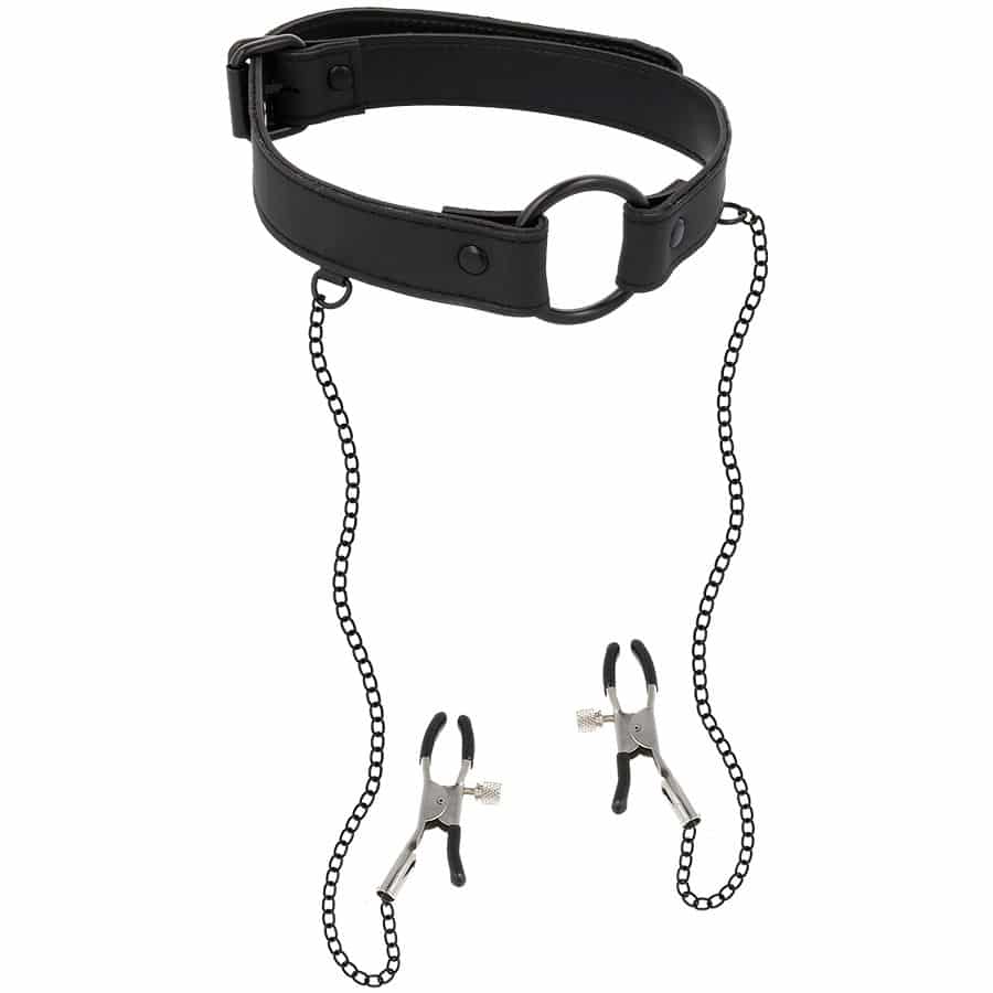 The leather collar has a strong ring to connect a strap and thus have your subject, well subject. The nipple clamps are connected to the collar with metal chains.