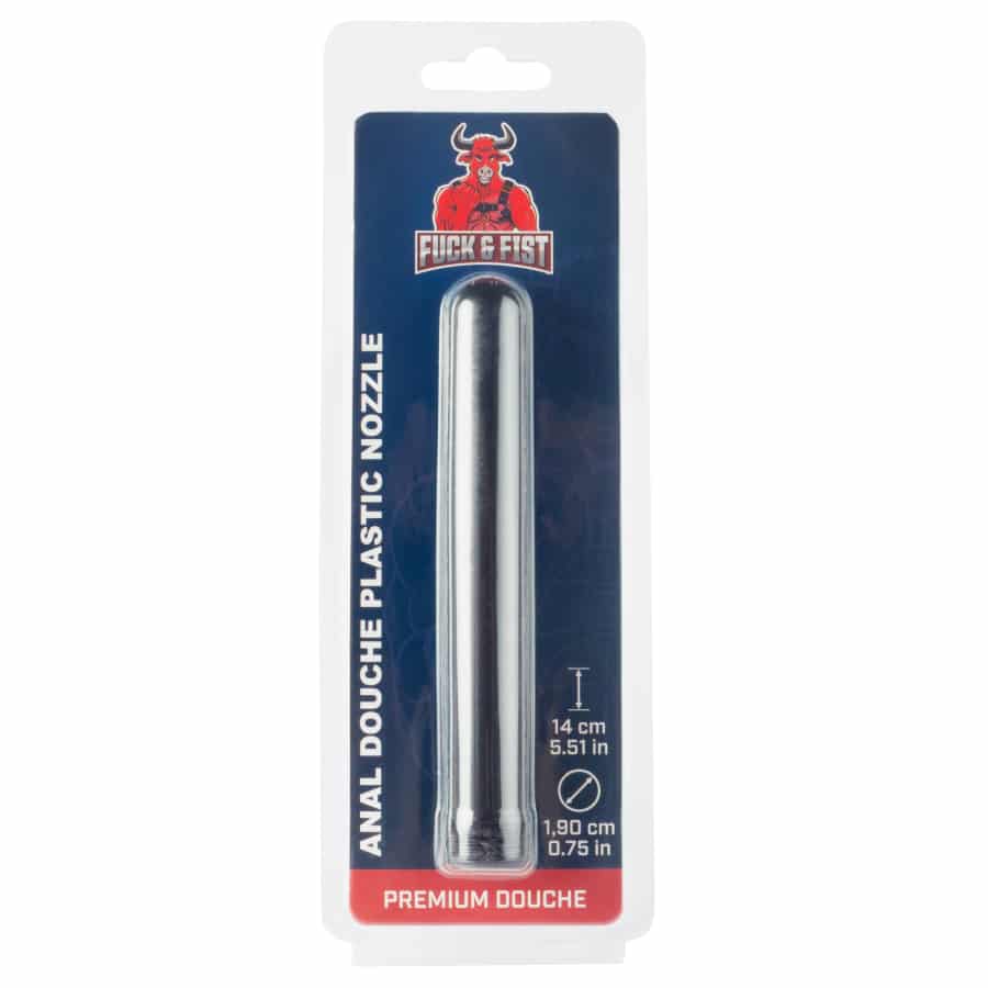 Anal enema tip with an insert length of 13.5 cm and a width of 1.9 cm.