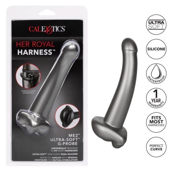 The Her Royal Harness? ME2? Ultra-Soft? G-Probe is made to thrust you and your lover into the orgasmic world of mutual stimulation. The perfectly angled shaft, sensually contoured base and dual ended design is made to thrill with every thrust. The curved shaft and sensually contoured base delivers deeply orgasmic internal and external mutual stimulation. Use the curved body, sensual contour base and cushy dual ended design to reach new climactic heights.
