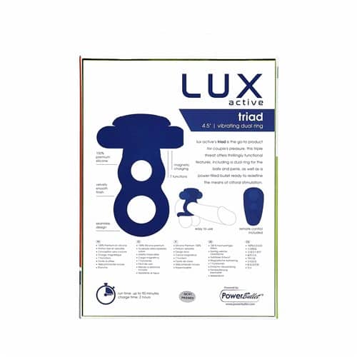Lux Active?s Triad is the go-to product for couple?s pleasure. This triple threat features thrillingly functional features, including a dual ring for the balls and penis to help achieve a bigger bulge and longer lasting erection.