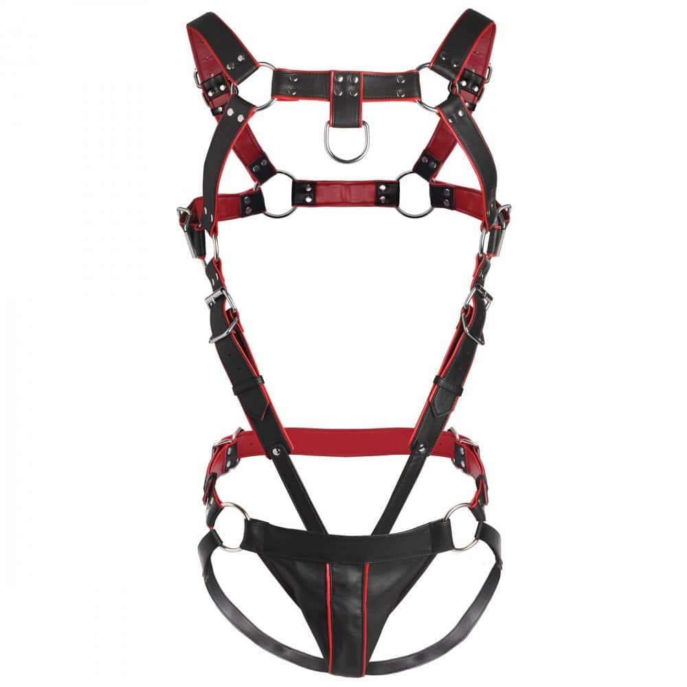 Harness your excitement in more ways than one! With this sexy, black and red, PU leather harness you can show off your body and tether the straps to your rod. Each strap is fully adjustable; use the nickel-free, metal buckles to cinch it tight. At the base of the harness is a 2 inch diameter (50mm) cock ring that serves the dual purpose of enhancing your erections and holding the harness in place. You can choose to expose your goods or cover them with a spacious, matching jock strap. The jock strap covers the front and still exposes your booty with two straps that go around the thighs and a belt that tightens around the waist. Spot clean with toy cleaner as needed and wipe with a soft cloth.