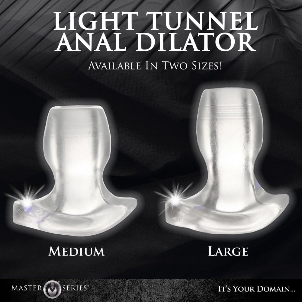After doing any needed warm-up stretching, lube up the dilator and slip it inside. Place your fingers inside the tunnel to help guide it in until the sphincter squeezes around the neck and the toy stops at the flared base. To make things easier, have the LED light already inserted into the toy and turned on. Then enjoy pouring any fluids or liquids into the tunnel, or gaze into the gaping hole, or see if you can insert an anal-safe toy inside the tunnel for extra stimulation. Have fun with this illuminated booty and enjoy!