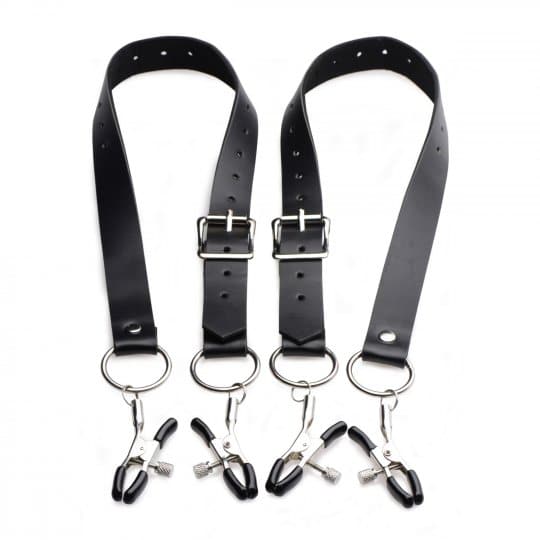 Turn up the intensity of your kinkiest scenes with these unique straps, designed to wrap around your thighs, clamp onto your labia, and spread them open! Perfect for humiliation play, gynecological roleplay, or whatever wicked fantasies you want to bring to life, this unique set keeps your partners genitals ultra sensitive and helplessly exposed like never before. The straps are lined on the interior with a velvety softness and have buckles to adjust the fit around your thighs. The rubber-tipped clamps have thumb screws that adjust their pressure. Get creative with your BDSM scenarios!