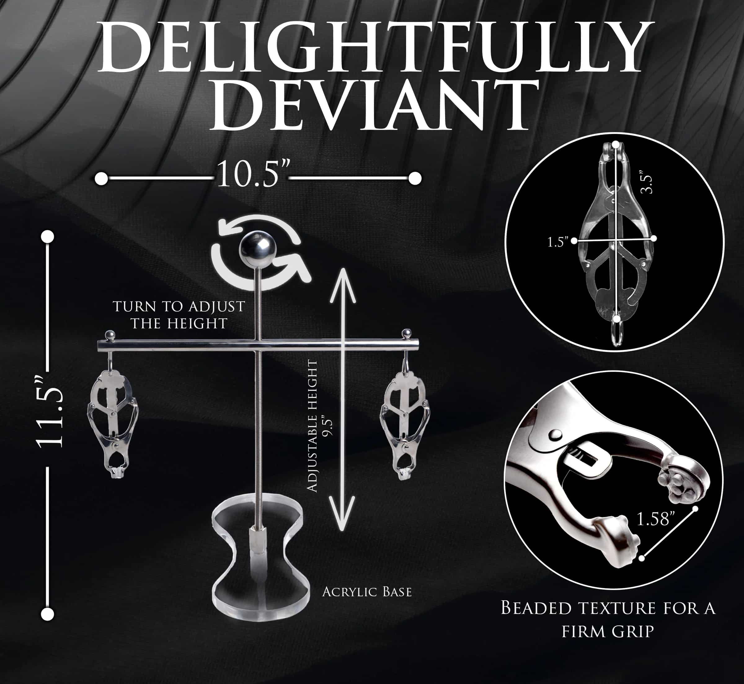 Put your submissive in a predicament: they can’t escape with this Tower of Pain! This tower has clover-style nipple-clamps that increase in pressure when they’re pulled on. The rubber tips protect the skin of the nipples and areola, but the pressure is wicked! The tower also adjusts in height so you can find the perfect height to torment them with! Made out of stainless steel, it is nickel-free and perfect for sensitive skin. The clear plastic acrylic pad sits between the nipples on their chest as a steady platform. It breaks down easily for storage or travel and can be cleaned with warm water and mild soap or a gentle cleaning solution.