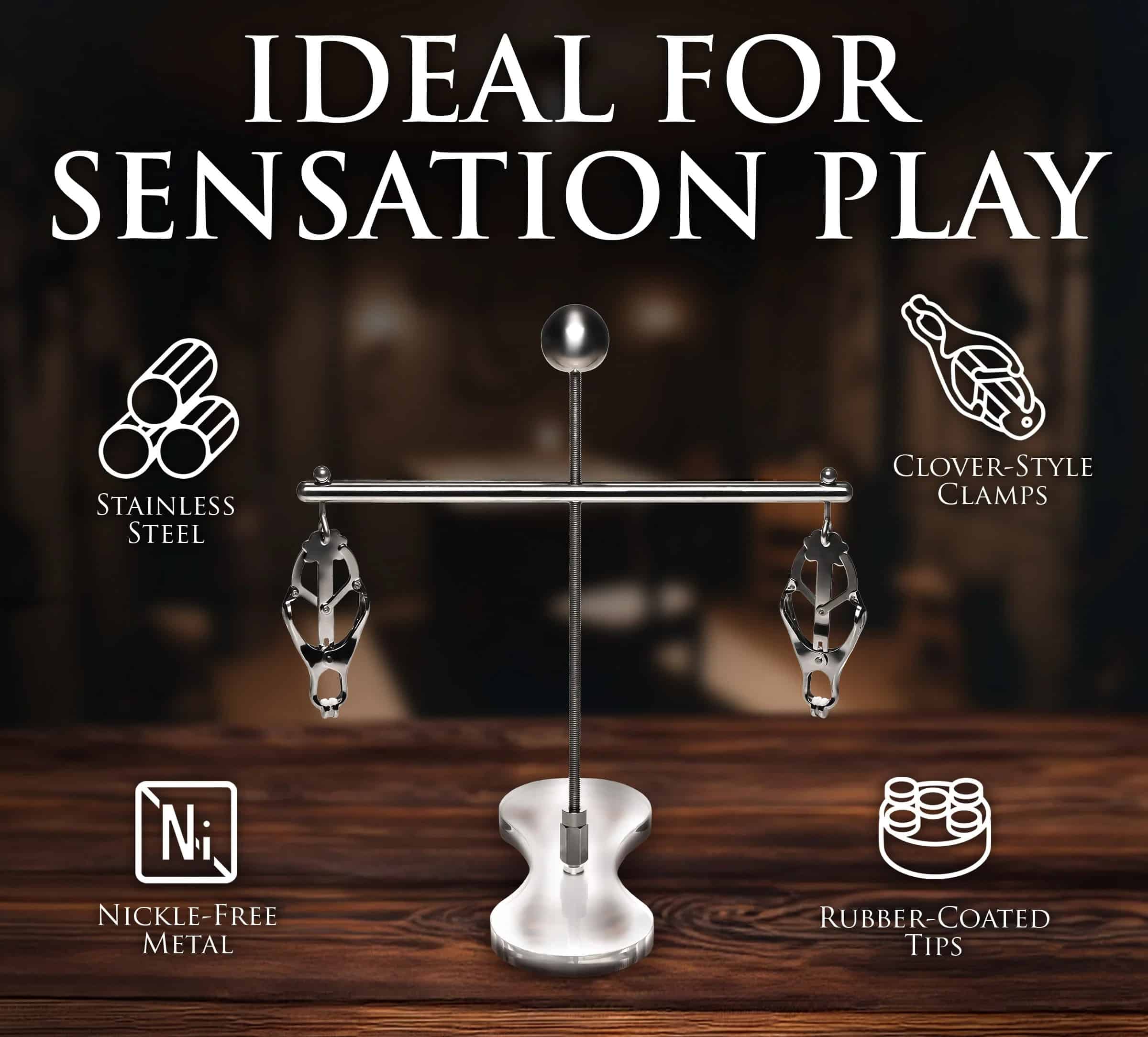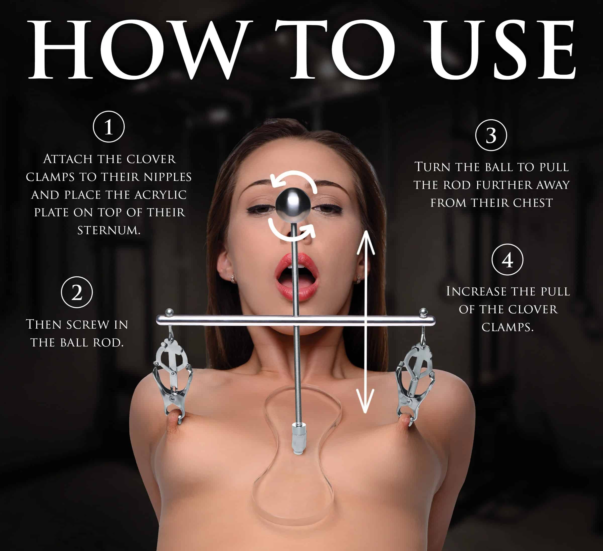 Lay them back, bare-chested, nipples exposed. Place the acrylic platform on their chest and then attach each of the clamps to their nipples. Grab the nipple, clamp onto the areola behind the nipple, and slowly release. As they get used to this sensation, crank up the height a little! Every time they relax their posture, the intensity of pressure increases! Tease them and play with them as they are held in place by this intense tower of pain!