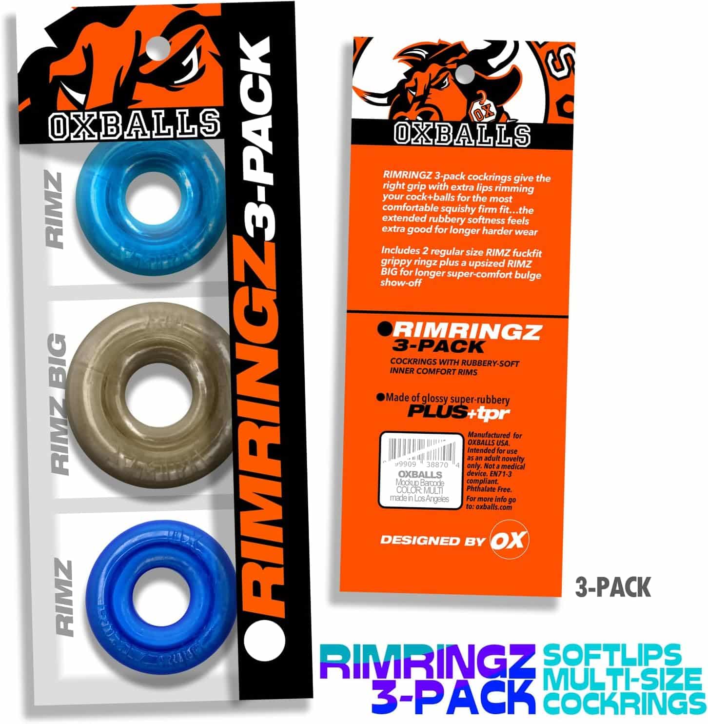 The Oxballs RIMRINGZ 3-Pack includes two RIMZ regular-size cockrings (Juice Orange & Hottie Pink) and one RIMZ BIG (Black)—all crafted from Oxballs’ premium FLEXtpr™. These rings are grippy but soft, thick but stretchy, firm but plush. They wrap your shaft and balls in squishy comfort, so you get maximum bulge and bone without the bite. Designed for play, for show, for stretch—this is the triple treat your cock has been waiting for.