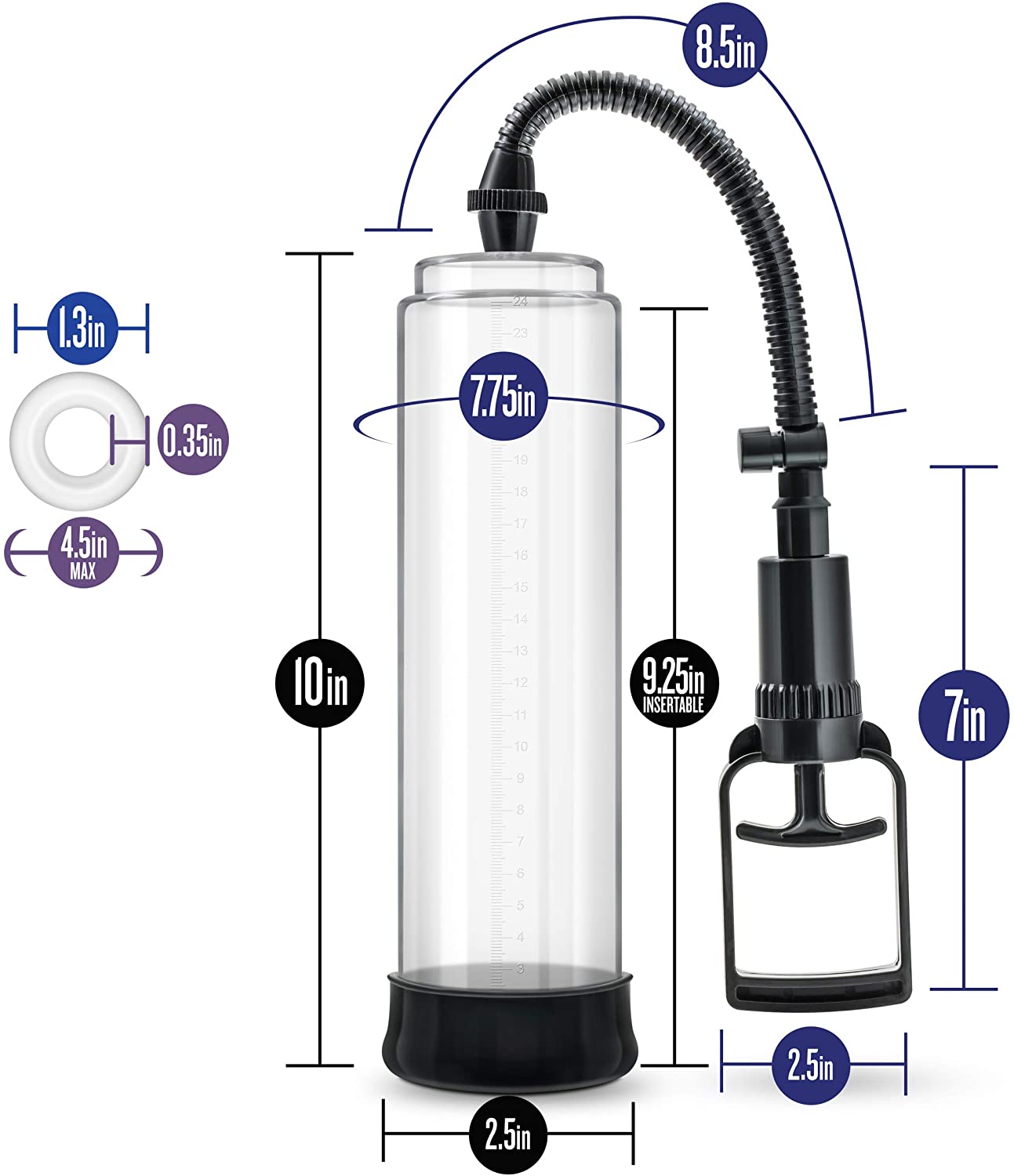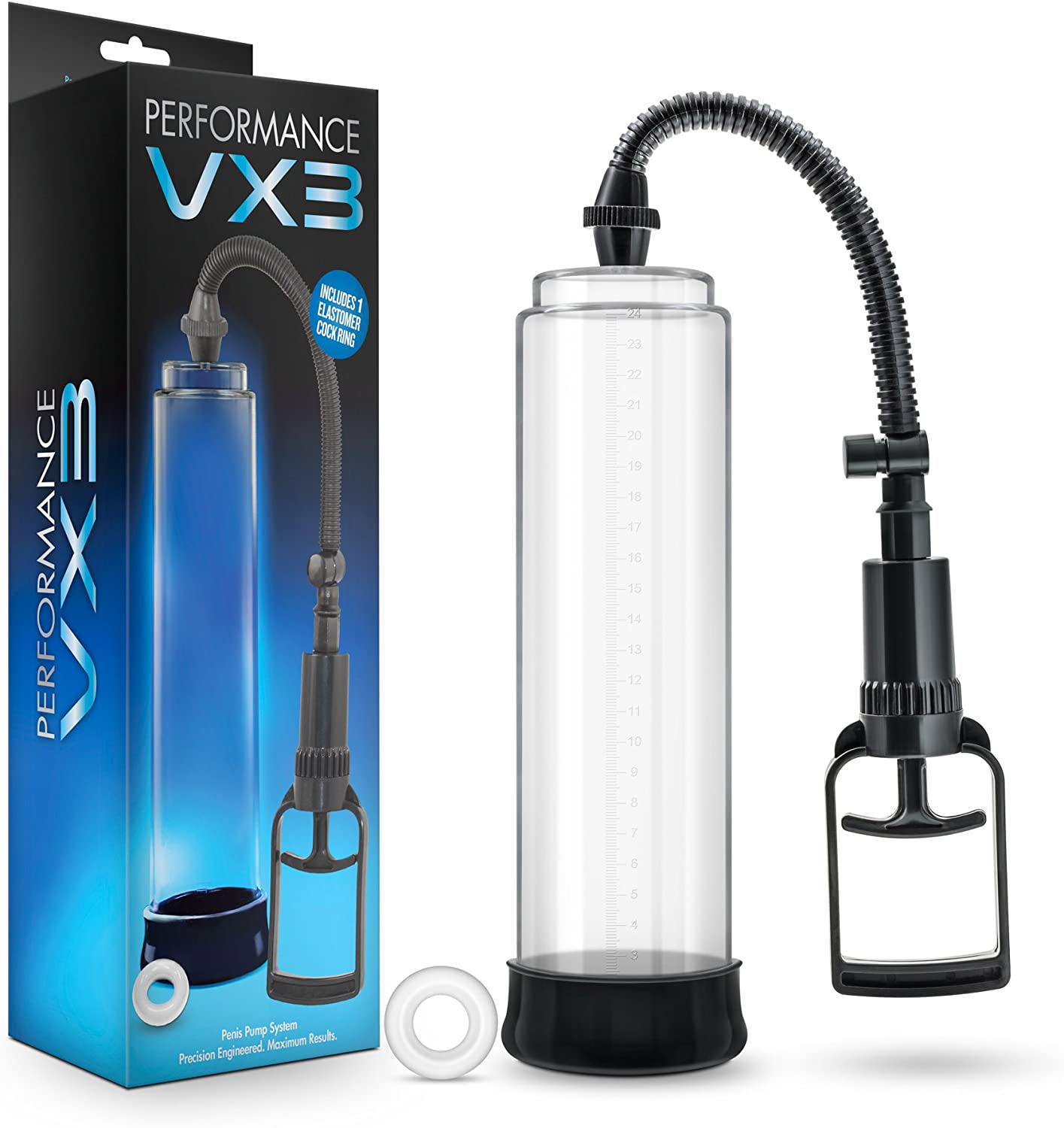 Performance VX3 is a gentlemen?s enhancement system that consists of a vacuum chamber, trigger pump, a soft removable airtight pump seal and a soft stretchy cock ring. Precision engineered vacuum chamber is clear for viewing progress measuring 2.5 inches wide, 10 inches in total length and accommodating 9.25 inches in penis length. Adjust the intensity with the two-finger pump control handle and disengage with the quick release valve. Bonus elastomer penis ring helps maintain erection and elongate each VX3 experience.