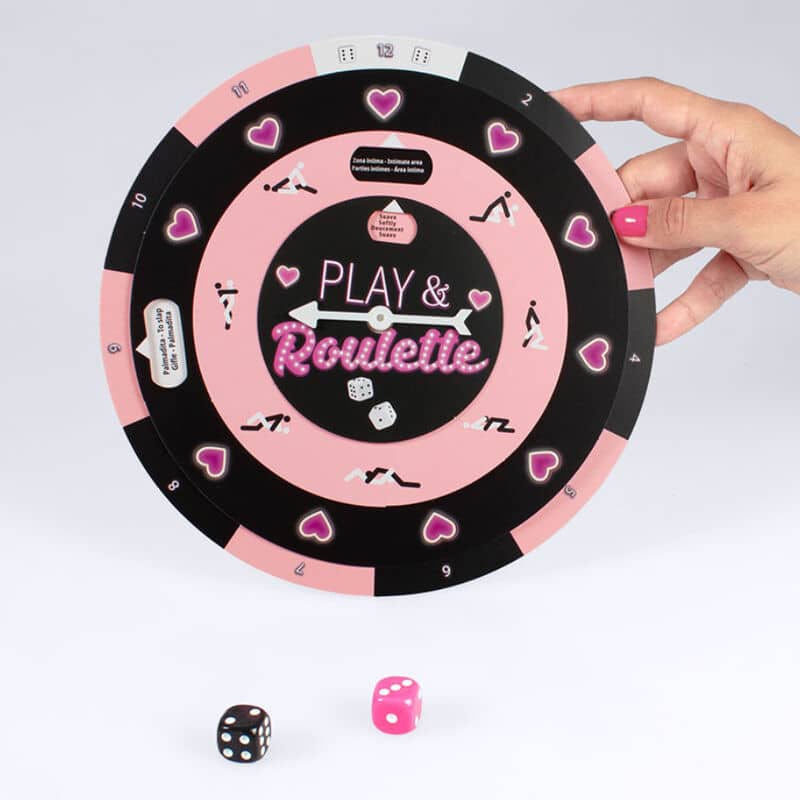 Each player rolls both dice three times, one for each roulette?s part, moving the arrow, every time, according to the addition number of the two dice. Once the arrow has been placed on the three parts, the player must perform the activity mentioned on the partner?s body part for the time that is being indicated. At any time during the game, if a player has double six (12) when he/she is rolling the dice, he/she must remove a piece of garment.