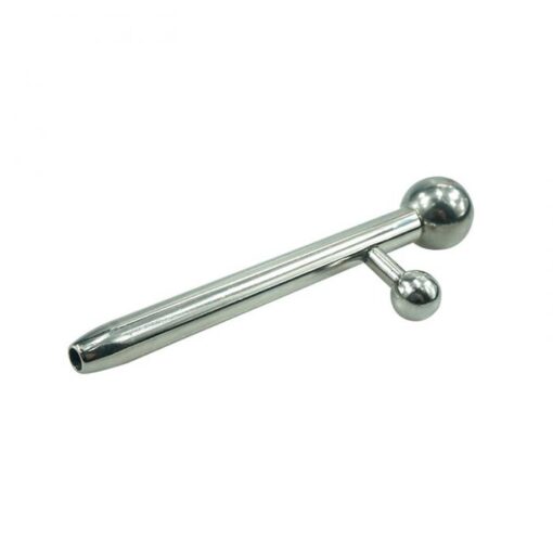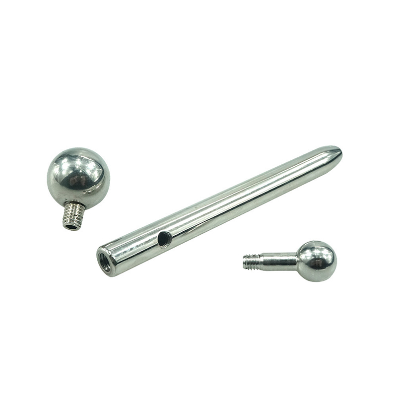 The wearer inserts the hollow tube into his urethra and keeps it in place by screwing the pin that is coming out of the side of the wand through his Price Albert piercing opening. He can then choose to remove or insert the threaded tip into the head of the wand to control his ejaculate.