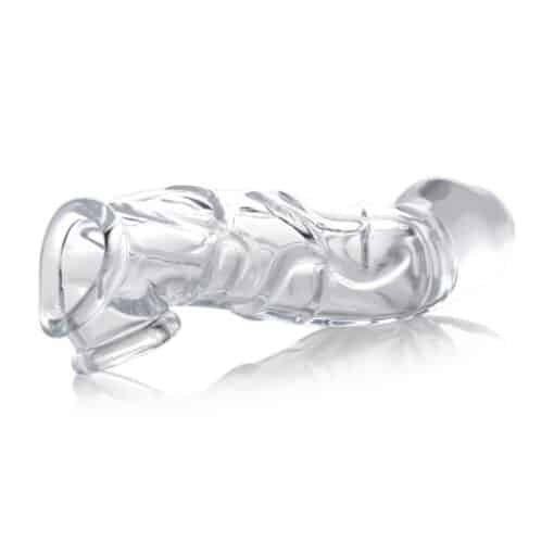This extender sleeve gives you two whole inches of solid penis to plow into your partner! The realistic texture, featuring a bulbous head and bulging veins, along with a subtle curved shape will deliver a new kind of internal massage. Just lube up and put your entire package through the first hole, allowing your scrotum to go through the bottom hole for a satisfying stretch. The solid 2 inch tip is followed by a hollow interior that allows for a snug and secure fit. This body-safe and phthalate-free material is compatible with silicone and water-based lubricants. Use warm water and mild soap or a toy cleaner to clean after use.