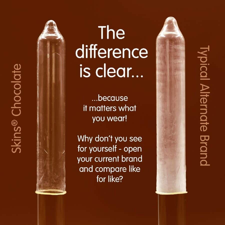 Introducing our new chocolate flavor 8-pack, featuring a sleek, ready-to-use design and up to 33% more condoms than the market leader. Appeal to those looking for a fun, high-quality intimate product with Skins chocolate flavor condoms. These individually wrapped condoms combine pleasurable taste with superior protection. These Skins condoms are a great way to combine two loves: sex and chocolate. Theyre lubricated and have a delicious chocolate aroma thats truly tempting, and they taste like chocolate too. Like all Skins condoms, theyre made from high-quality, dermatologically tested latex, giving you the protection you need.